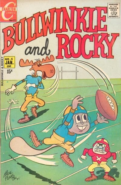 Notes: Bullwinkle passes a football to an airborne Rocky, watched with hatred by a grounded Boris.